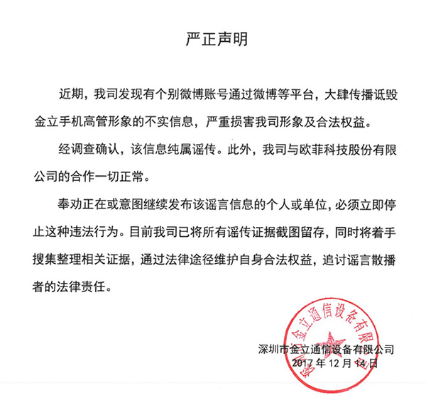 “經(jīng)調(diào)查確認,該消息純屬謠傳,此外,我司與歐菲科技股份有限公司的合作一切正常。”金立同時稱,公司已將所有謠傳證據(jù)截圖留存,計劃用法律途徑維護自身合法權(quán)益。