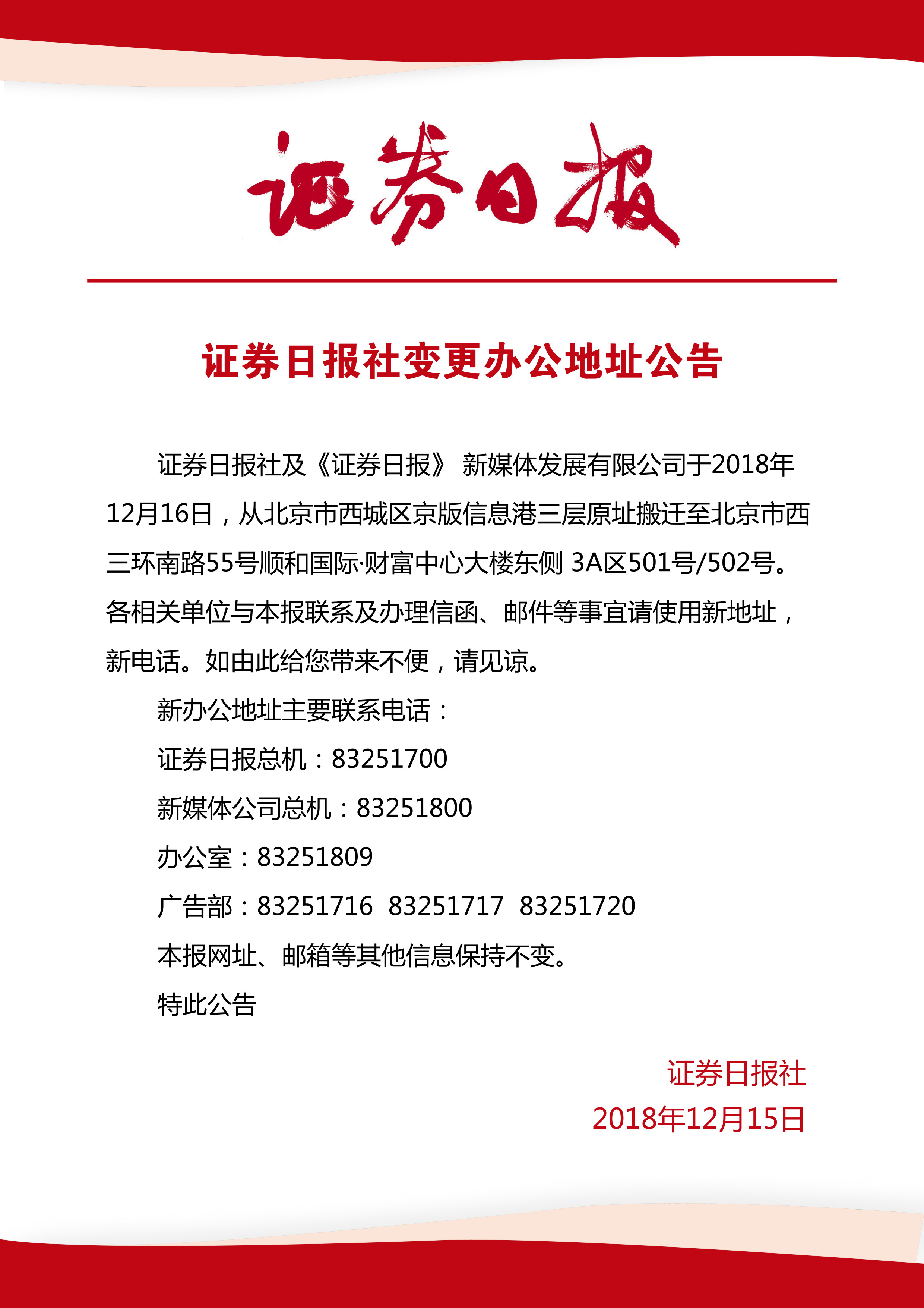證券日?qǐng)?bào)社及《證券日?qǐng)?bào)》新媒體發(fā)展有限公司于2018年12月16日,從北京市西城區(qū)京版信息港三層原址搬遷至北京市西三環(huán)南路55號(hào)順和國(guó)際·財(cái)富中心大樓東側(cè)3A區(qū)501號(hào)/502號(hào)。各相關(guān)單位與本報(bào)聯(lián)系及辦理信函、郵件等事宜請(qǐng)使用新地址,新電話。如由此給您帶來(lái)不便,請(qǐng)見(jiàn)諒。