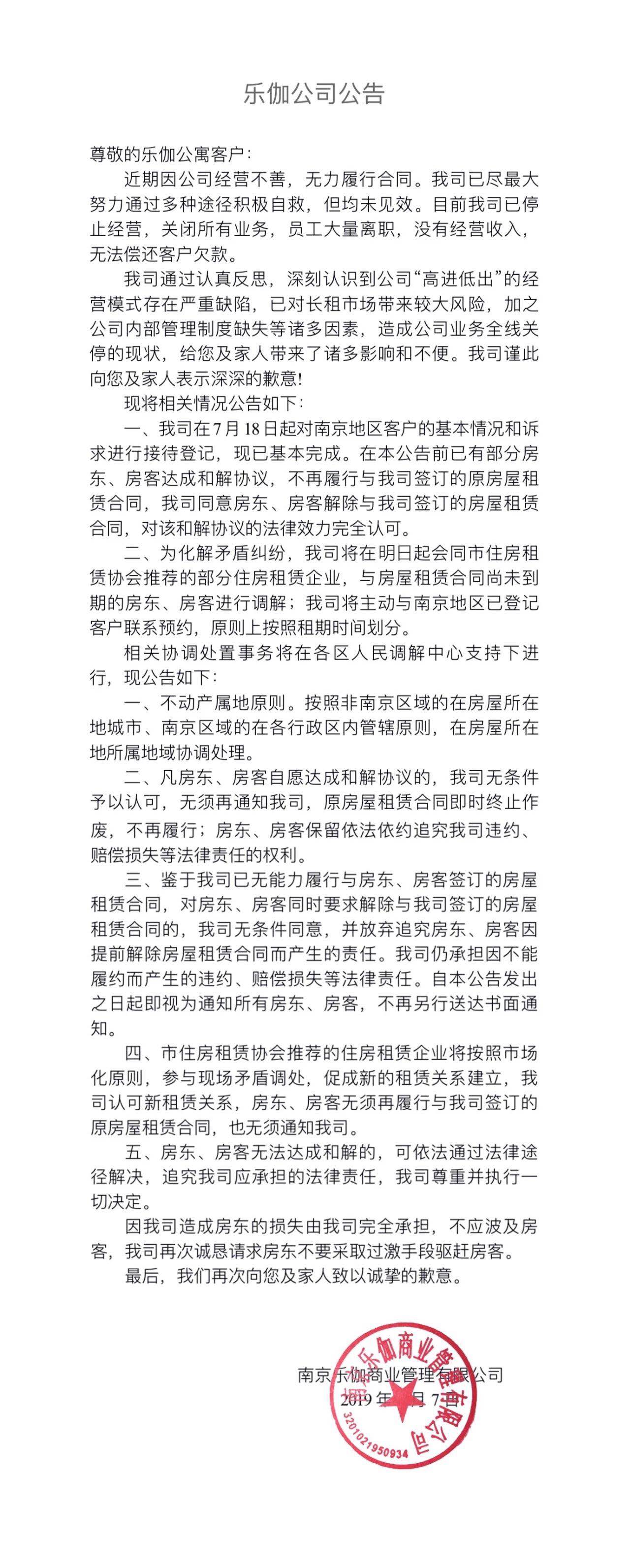 據悉,樂伽公司通過微信公眾平臺發(fā)布一則公告,確認公司已停止經營。樂伽公司表示,公司“高進低出”的經營模式存在嚴重缺陷,已對長租市場帶來較大風險,加之公司內部管理制度缺失等諸多因素,造成公司業(yè)務全線關停現狀。