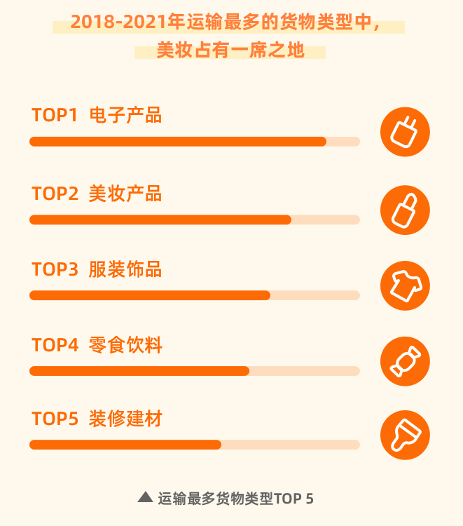 另一方面,2018-2021年間,電子產(chǎn)品仍是華強(qiáng)北運輸最多的貨物品類,持續(xù)享譽(yù)“中國電子第一街”的稱號,但美妝產(chǎn)品運輸量的表現(xiàn)也突出,僅次于電子產(chǎn)品。