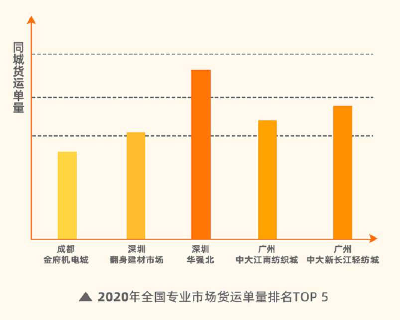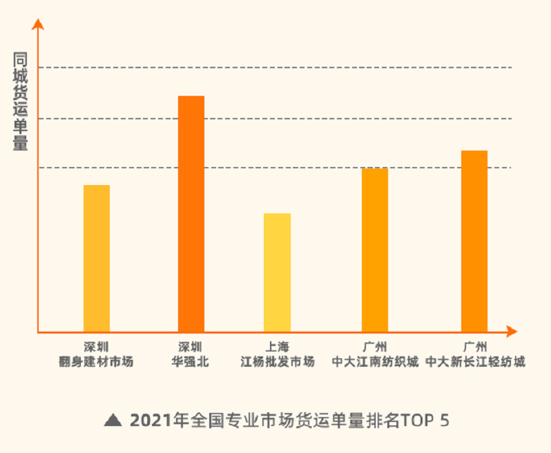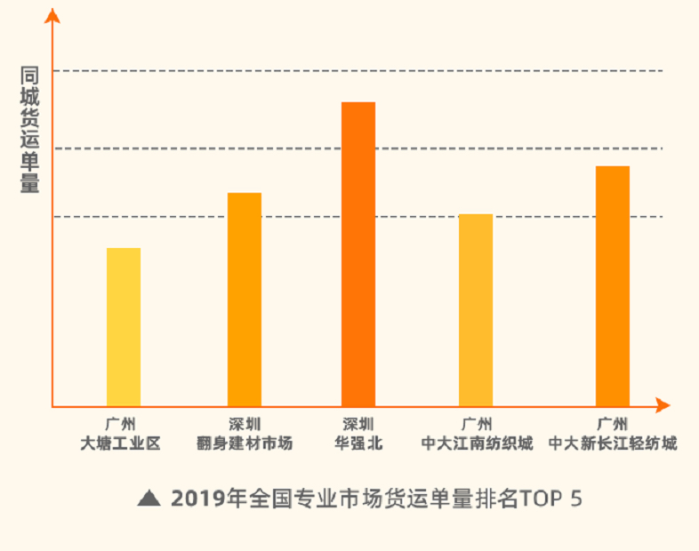 2019-2021年,華強(qiáng)北在全國專業(yè)市場同城貨運單量排名里蟬聯(lián)第一,廣州中大新長江輕紡城則穩(wěn)居第二。其中,廣州重大江南紡織城、深圳翻身建材市場也連續(xù)3年進(jìn)入排名前5名,貨運量穩(wěn)定。