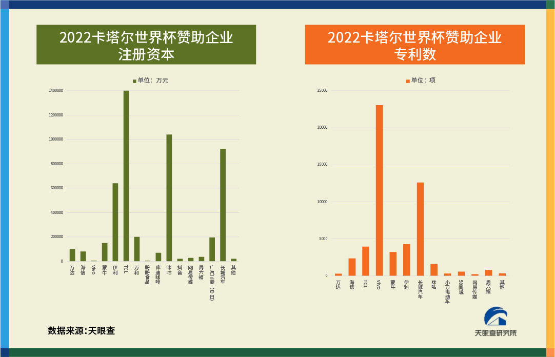 贊助世界杯的企業(yè)中,不乏注冊資本雄厚者。據(jù)天眼查數(shù)據(jù)顯示,TCL、咪咕、長城汽車三家企業(yè)注冊資本位居前三。其中,攜手巴西隊征戰(zhàn)世界杯的智能制造科技企業(yè)TCL注冊資本高達140.3億元,可以購買7000萬個世界杯紀念足球,鋪滿約1500個足球場。