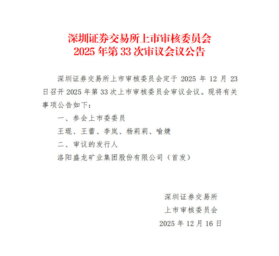 本報(bào)訊 (記者肖艷青)12月16日,深圳證券交易所公告顯示,深圳證券交易所上市審核委員會(huì)定于2025年12月23日召開2025年第33次上市審核委員會(huì)審議會(huì)議,審議洛陽(yáng)盛龍礦業(yè)集團(tuán)股份有限公司(首發(fā))(以下簡(jiǎn)稱“盛龍股份”)。
