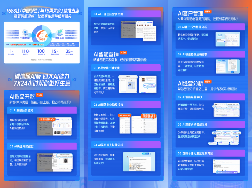 據(jù)悉,誠(chéng)信通AI版通過AI選品開款、AI智能營(yíng)銷、AI客戶管理、AI經(jīng)營(yíng)分析四大核心能力,7x24小時(shí)助力生意全流程,幫助商家從傳統(tǒng)經(jīng)營(yíng)向智能經(jīng)營(yíng)模式升級(jí),降低中小企業(yè)生意門檻,讓每個(gè)中小企業(yè)擁有自己的生意Agent,讓每一個(gè)源頭廠商的生意更簡(jiǎn)單。