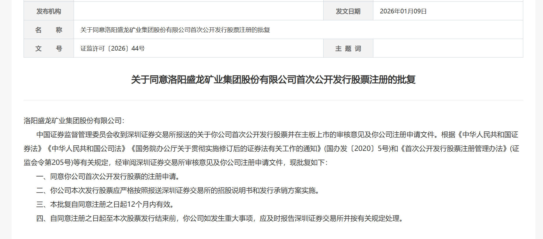 本報(bào)訊 (記者肖艷青)1月9日,中國證監(jiān)會(huì)官網(wǎng)消息,證監(jiān)會(huì)批復(fù)同意洛陽盛龍礦業(yè)集團(tuán)股份有限公司(以下簡(jiǎn)稱“盛龍股份”)首次公開發(fā)行股票的注冊(cè)申請(qǐng)。本批復(fù)自同意注冊(cè)之日起12個(gè)月內(nèi)有效。