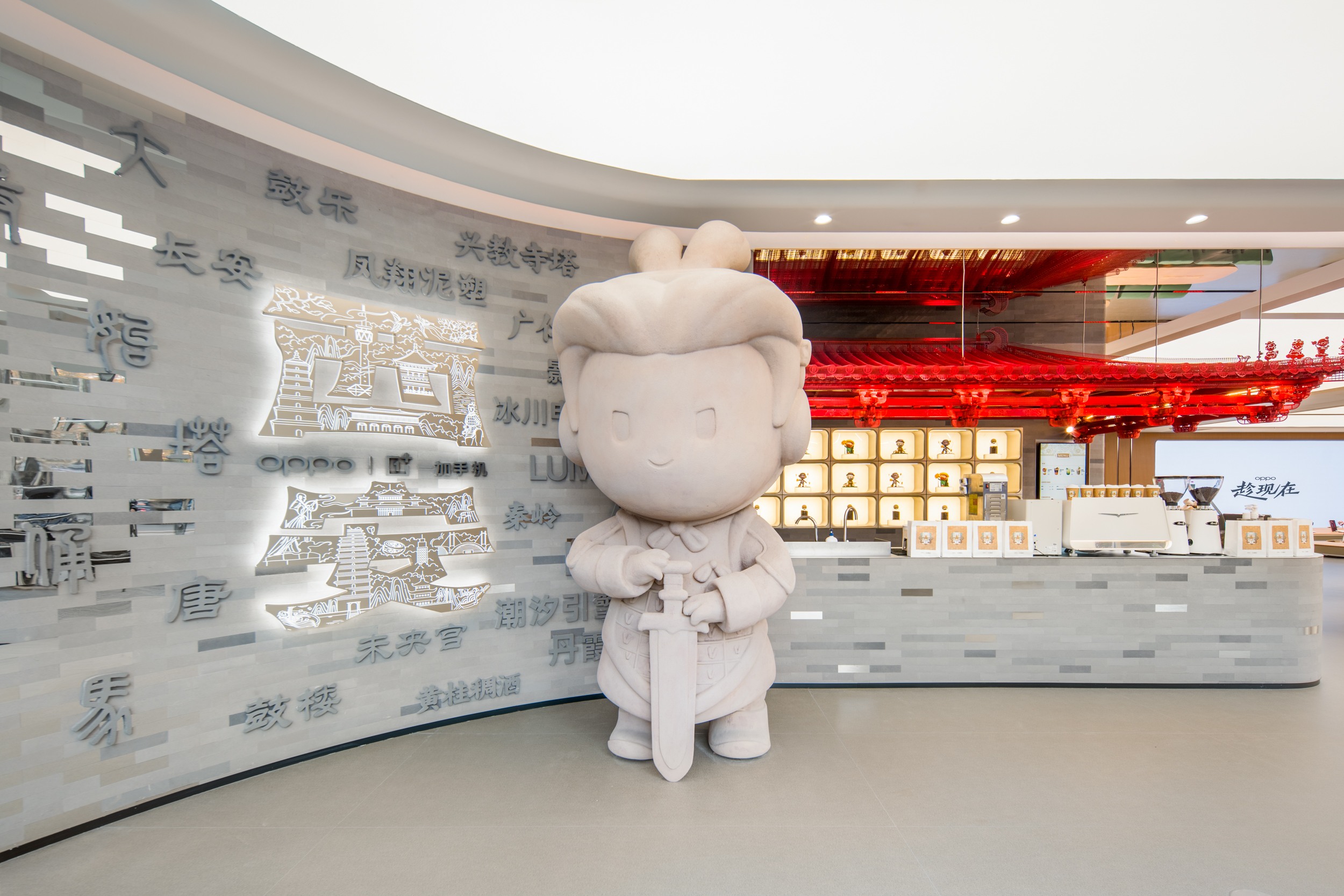 為了重現(xiàn)古代“長(zhǎng)安三萬(wàn)里”的遼闊詩(shī)境,西安旗艦店參考古都“八水繞長(zhǎng)安”的歷史格局,首次將“水”之意象融入室內(nèi)空間,實(shí)現(xiàn)山水意境同當(dāng)代藝術(shù)交織。同時(shí),門店對(duì)西安標(biāo)志性IP進(jìn)行創(chuàng)意重塑,打造全新形象「兵馬俑小歐」,該形象既保留將軍俑標(biāo)志性的站姿原型,又創(chuàng)新塑造出松弛有趣的坐姿造型。室內(nèi)外設(shè)置的俑像彼此呼應(yīng),形成歷史與當(dāng)下的生動(dòng)對(duì)話。