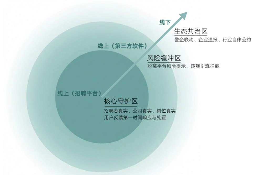 2025年,BOSS直聘根據(jù)求職場景與風控系統(tǒng)覆蓋能力,將求職安全保護拆分為核心守護區(qū)、風險緩沖區(qū)與生態(tài)共治區(qū),并聯(lián)合多方進行全域共治。