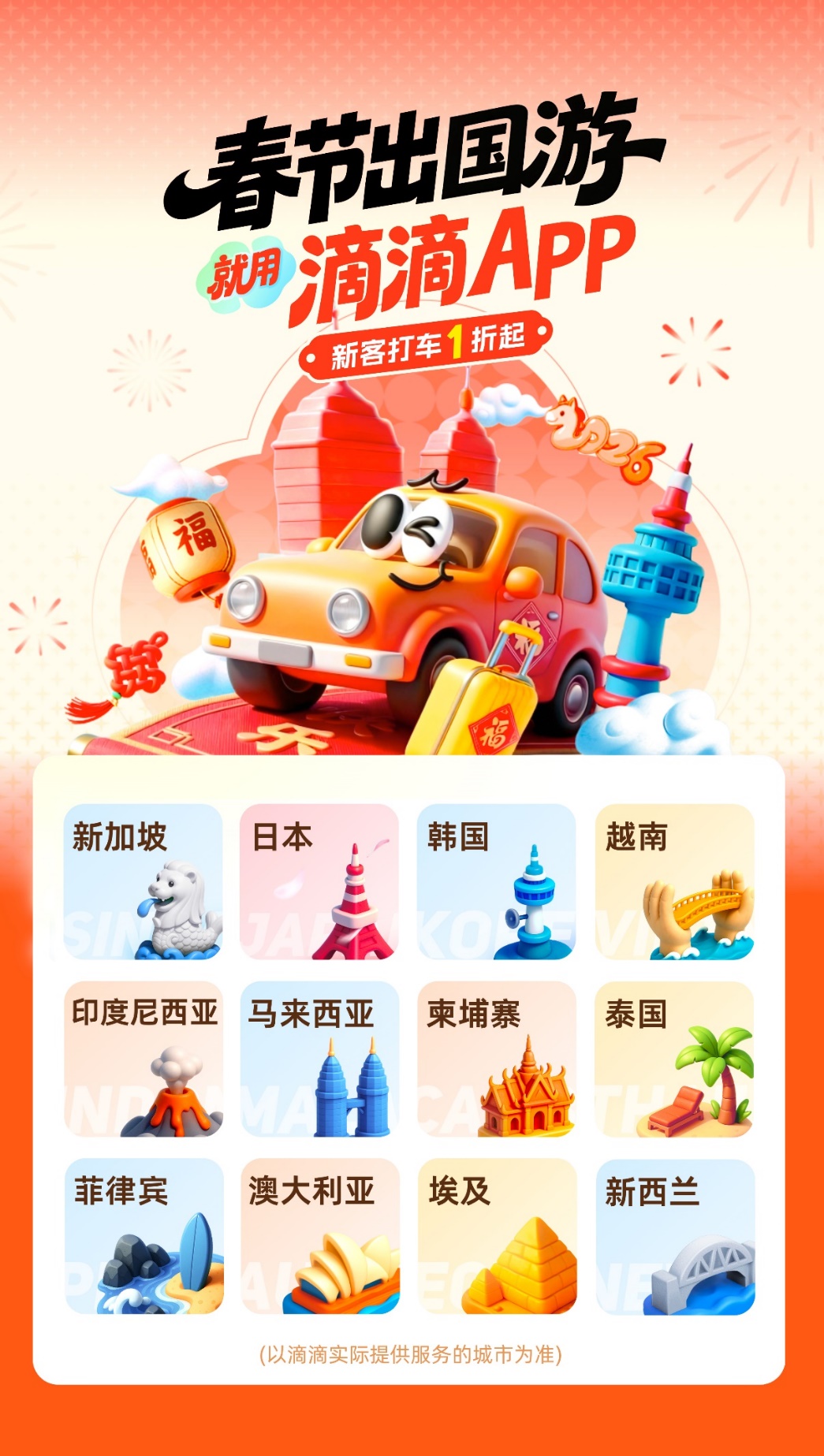 春節(jié)將至,闔家團(tuán)圓之際,越來(lái)越多的中國(guó)家庭選擇走出國(guó)門(mén),開(kāi)啟一場(chǎng)溫馨的海外之旅。為讓春節(jié)假期出國(guó)漫游的用戶享受更便利、更實(shí)惠的中文打車(chē)服務(wù),滴滴海外出行推出春節(jié)優(yōu)惠活動(dòng),覆蓋海外出行已開(kāi)通服務(wù)國(guó)家。春節(jié)出國(guó)漫游用滴滴,打車(chē)超方便。