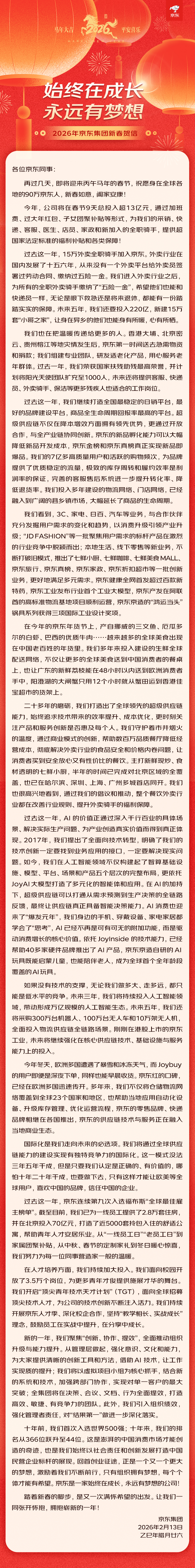 本報(bào)訊 (記者梁傲男)2月13日,京東集團(tuán)面向全球90萬(wàn)京東人發(fā)布新春賀信,今年的新春賀信以《始終在成長(zhǎng),永遠(yuǎn)有夢(mèng)想》為主題,全文如下: