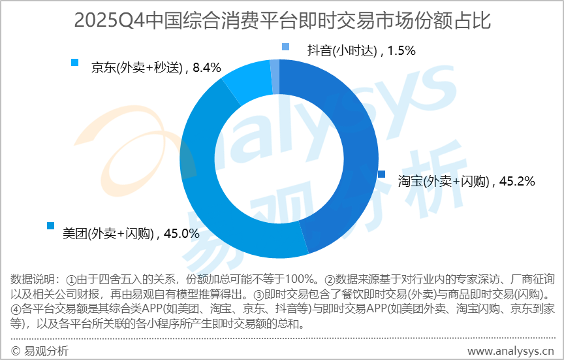 本報(bào)訊 (記者梁傲男)3月14日,第三方研究機(jī)構(gòu)易觀分析發(fā)布即時(shí)零售市場(chǎng)報(bào)告顯示,2025年第四季度淘寶閃購(gòu)即時(shí)交易市場(chǎng)份額為45.2%,美團(tuán)為45.0%,兩者份額差距僅0.2個(gè)百分點(diǎn),即時(shí)零售市場(chǎng)呈現(xiàn)多平臺(tái)競(jìng)爭(zhēng)態(tài)勢(shì);京東即時(shí)交易市場(chǎng)份額為8.4%,位列第三。