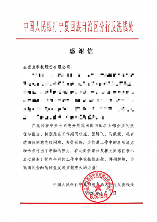 近日,企查查科技股份有限公司收到中國人民銀行寧夏回族自治區(qū)分行反洗錢處發(fā)來的感謝信,對其在一項緊急任務(wù)中憑借科技實力提供的鼎力支持表示衷心感謝。信中指出,企查查在任務(wù)中充分展現(xiàn)出國內(nèi)知名頭部企業(yè)的責(zé)任與擔(dān)當(dāng),其AI技術(shù)賦能下的服務(wù)能力,有力保障了工作任務(wù)的圓滿完成。