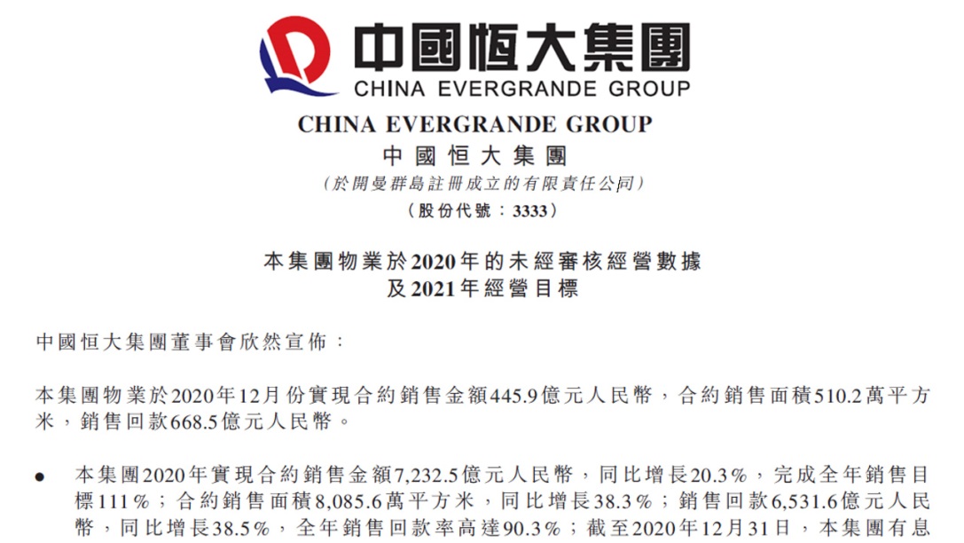 1月5日,中國(guó)恒大(3333.HK)發(fā)布公告稱,2020年全年集團(tuán)實(shí)現(xiàn)銷(xiāo)售7232.5億元,同比增長(zhǎng)20.3%,完成全年銷(xiāo)售目標(biāo)111%;銷(xiāo)售面積8085.6萬(wàn)平方米,同比增長(zhǎng)38.3%;銷(xiāo)售回款6531.6億元,同比增長(zhǎng)38.5%,全年回款率90.3%。