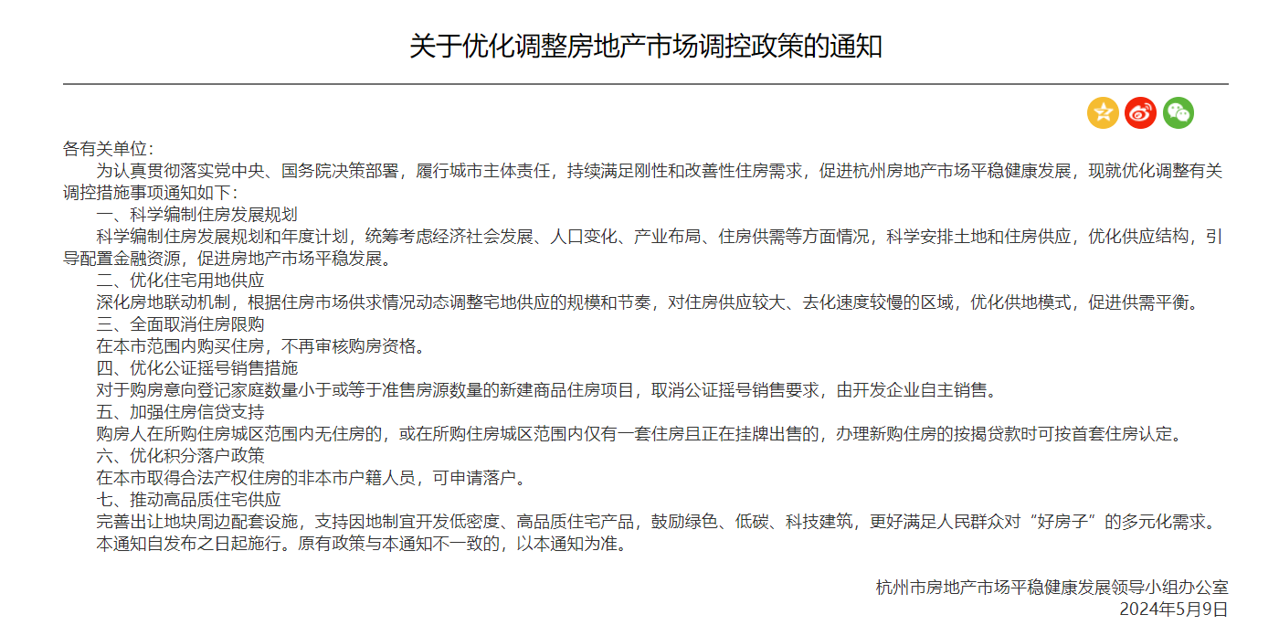 5月9日,杭州市房地產(chǎn)市場(chǎng)平穩(wěn)健康發(fā)展領(lǐng)導(dǎo)小組辦公室發(fā)布《關(guān)于優(yōu)化調(diào)整房地產(chǎn)市場(chǎng)調(diào)控政策的通知》(以下簡(jiǎn)稱《通知》)。
