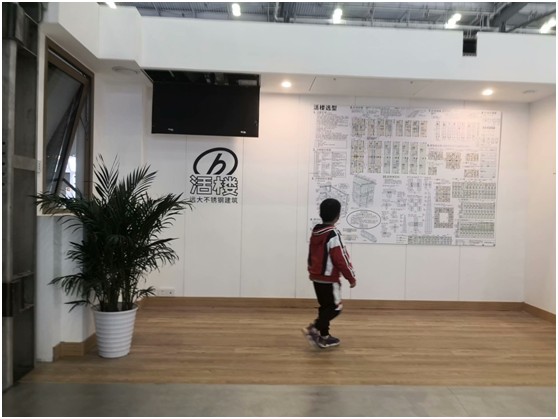 在遠(yuǎn)大筑工的“活樓”樣板間內(nèi)孩子正在看“活樓”的設(shè)計(jì)理念圖(攝影:肖偉)