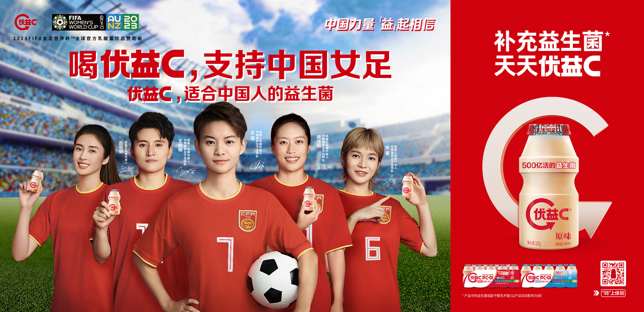 有人說,你永遠(yuǎn)可以相信中國女足。32年來,中國女足歷經(jīng)七屆世界杯,既有創(chuàng)造歷史的輝煌,也有遭遇失敗的灰暗,但中國女足一直展現(xiàn)出一種“永不言棄、永不放棄、敢于拼搏”的精神,不斷前行創(chuàng)造偉大。這種對(duì)專注與持之以恒積淀自我力量的共同追求,同樣作為國民IP/品牌的地位,讓優(yōu)益C與中國女足在去年五月達(dá)成合作——蒙牛優(yōu)益C成為中國足協(xié)中國之隊(duì)官方益生菌飲品贊助商,中國女足隊(duì)員出任優(yōu)益C代言人。