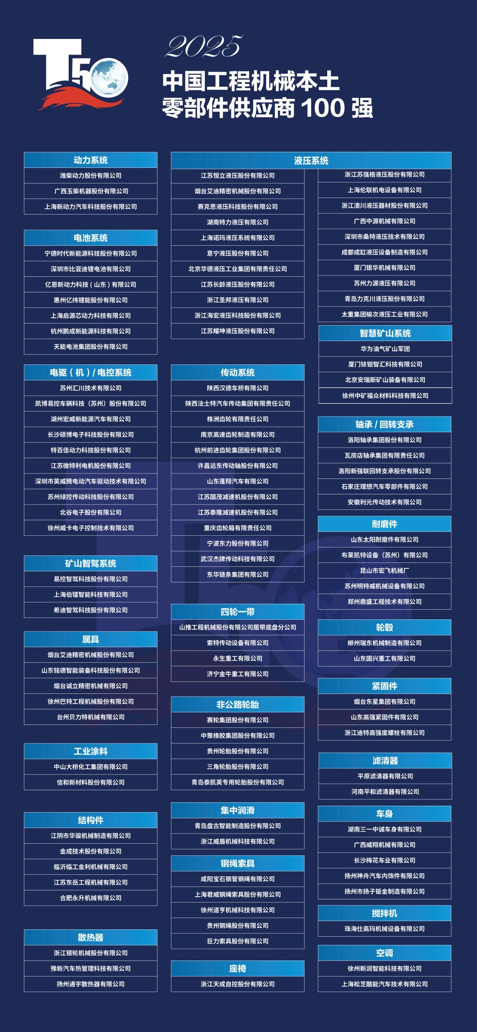 本屆“中國工程機(jī)械零部件供應(yīng)商100強(qiáng)”榜單,除覆蓋動力系統(tǒng)、液壓傳動、四輪一帶、屬具、結(jié)構(gòu)件、車身、鋼繩索具、涂料等傳統(tǒng)部件外,還增設(shè)了電池系統(tǒng)、電驅(qū)電控、智慧礦山、礦山智駕等前沿領(lǐng)域,共24種細(xì)分品類。