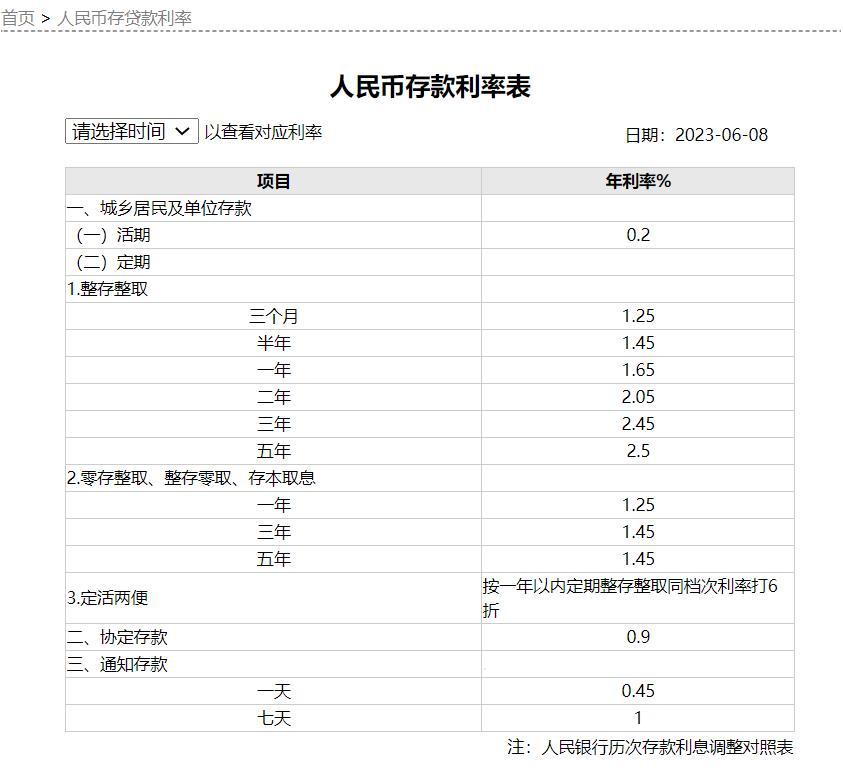 以工商銀行為例,6月8日起,工商銀行整存整取利率分別為:三個月1.25%、半年1.45%、一年1.65%、二年2.05%、三年2.45%、五年2.5%。“零存整取、整存零取、存本取息”類分別為一年1.25%、三年1.45%、五年1.45%。