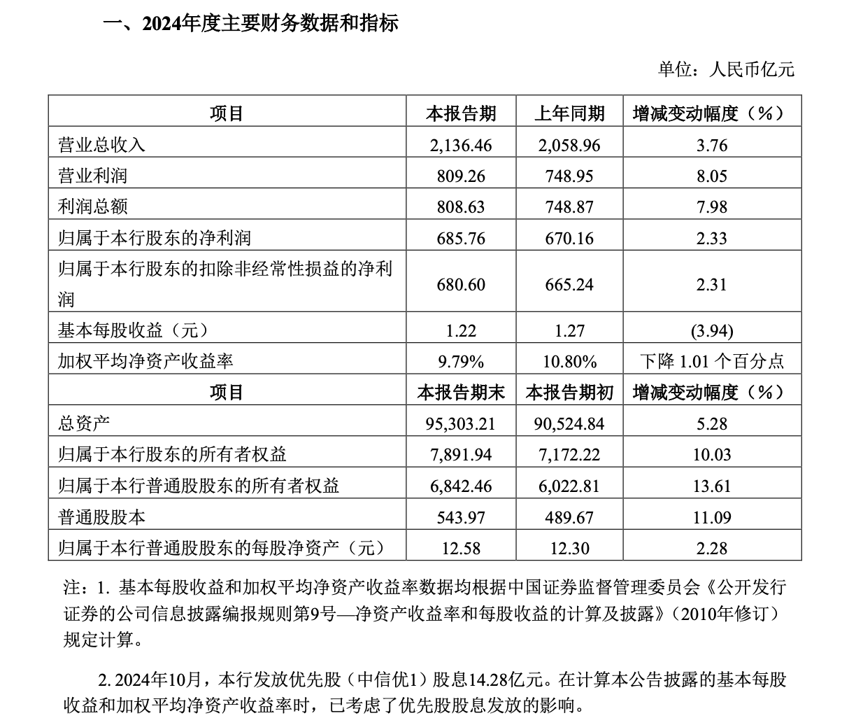 (中信銀行2024年主要財(cái)務(wù)數(shù)據(jù)和指標(biāo))
