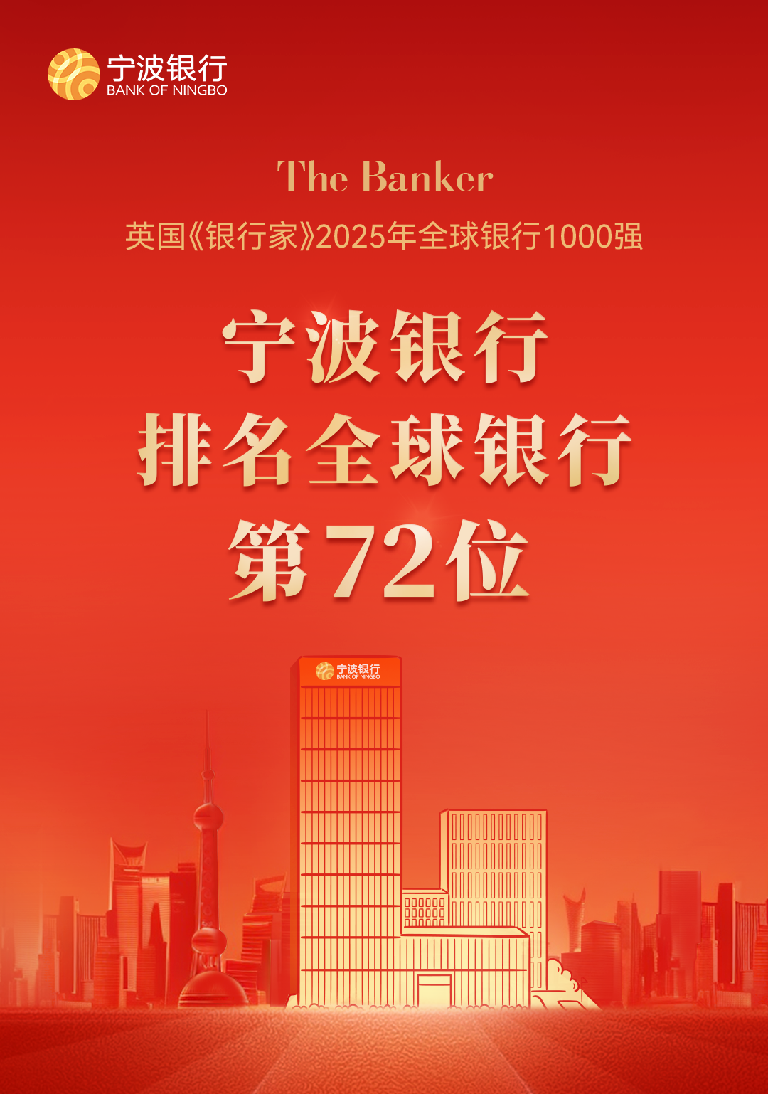7月2日,英國(guó)《銀行家》雜志(TheBanker)發(fā)布2025年“全球銀行1000強(qiáng)”榜單,寧波銀行股份有限公司(股票簡(jiǎn)稱:寧波銀行股票代碼:002142)以一級(jí)資本315.68億美元排名第72位,較上一年度上升8位,在全球百強(qiáng)銀行中的位次穩(wěn)步向前。