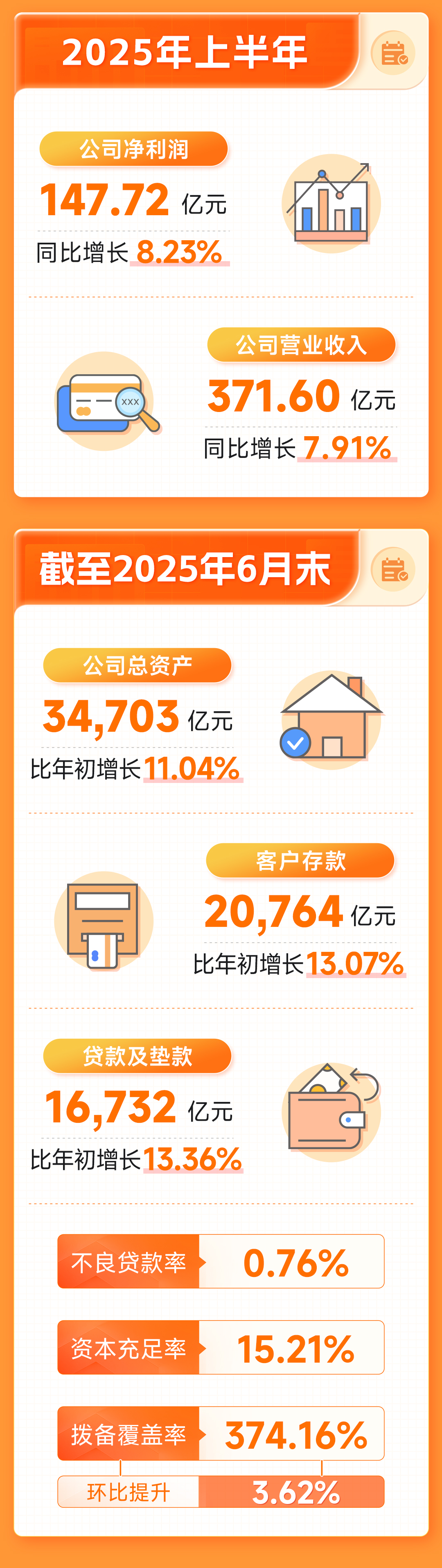 2025年上半年,寧波銀行營業(yè)收入371.60億元,較上年同期增長7.91%;實現(xiàn)歸屬于母公司股東的凈利潤147.72億元,較上年同期增長8.23%;年化加權(quán)平均凈資產(chǎn)收益率13.80%。