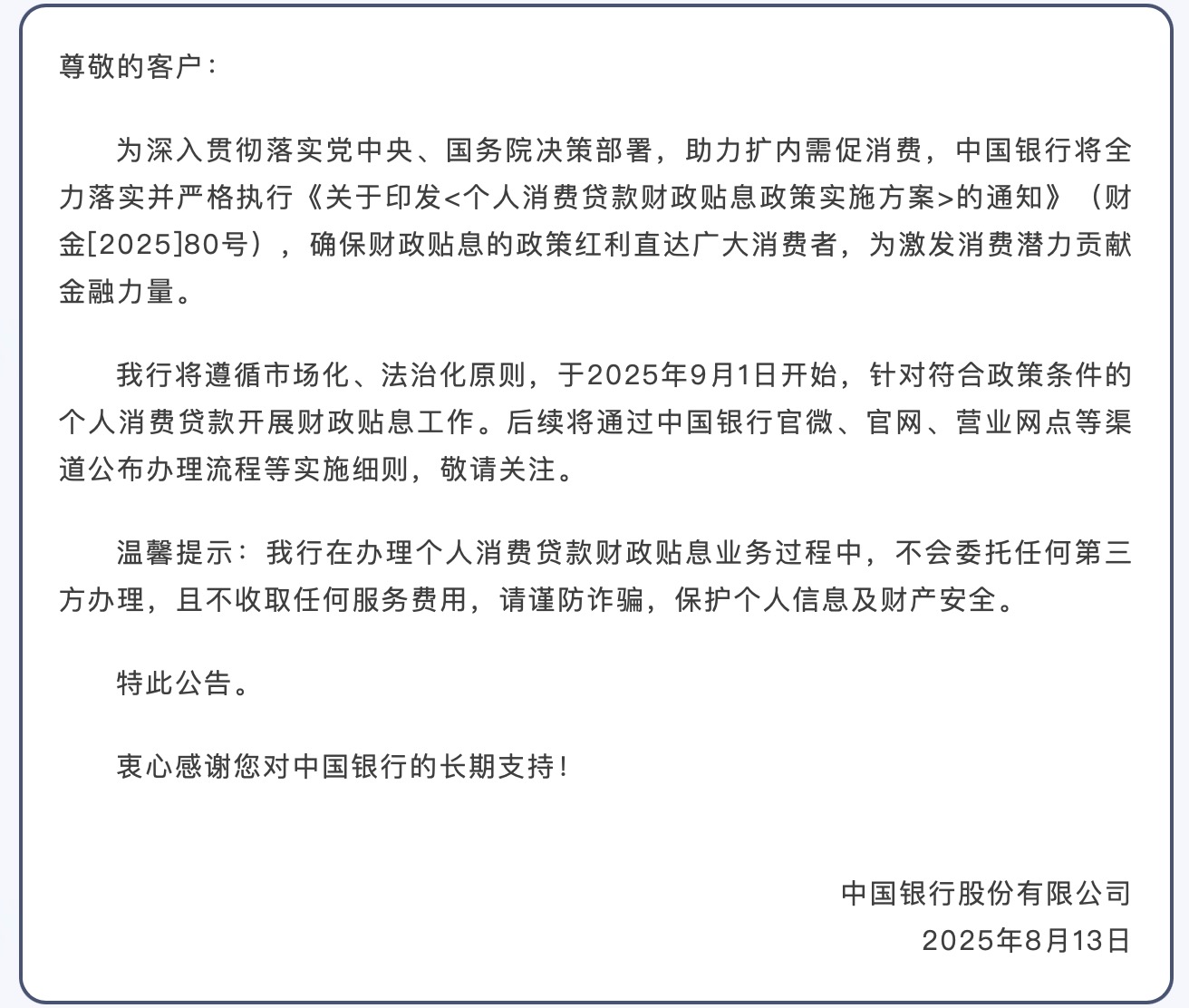 中國銀行公告表示,將遵循市場化、法治化原則,于2025年9月1日開始,針對符合政策條件的個(gè)人消費(fèi)貸款開展財(cái)政貼息工作。