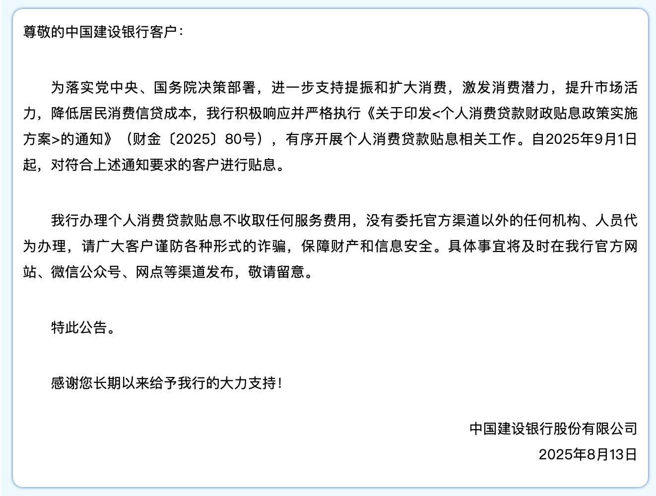 建設(shè)銀行公告提到,為落實(shí)黨中央、國務(wù)院決策部署,進(jìn)一步支持提振和擴(kuò)大消費(fèi),激發(fā)消費(fèi)潛力,提升市場活力,降低居民消費(fèi)信貸成本,我行積極響應(yīng)并嚴(yán)格執(zhí)行《實(shí)施方案》,有序開展個(gè)人消費(fèi)貸款貼息相關(guān)工作。自2025年9月1日起,對符合上述通知要求的客戶進(jìn)行貼息。