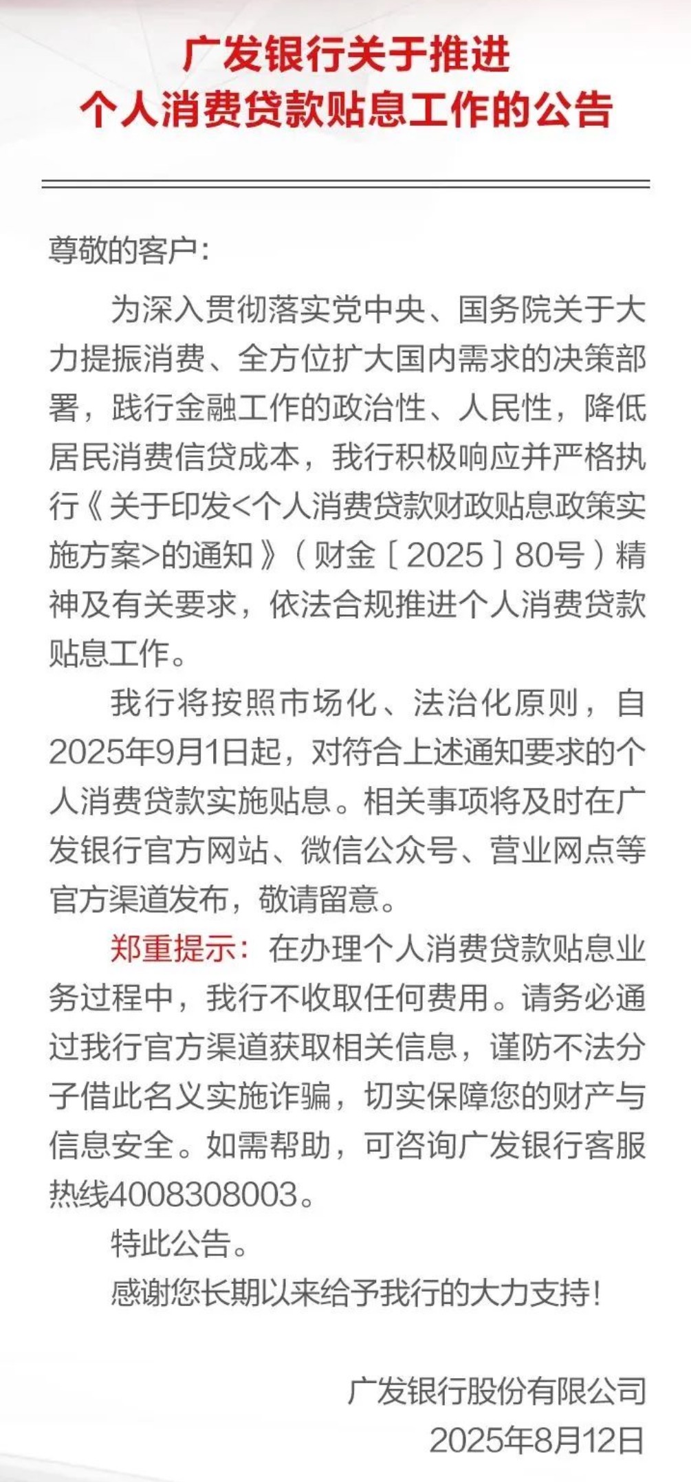 廣發(fā)銀行公告提到,將按照市場化、法治化原則,自2025年9月1日起,對符合通知要求的個(gè)人消費(fèi)貸款實(shí)施貼息。