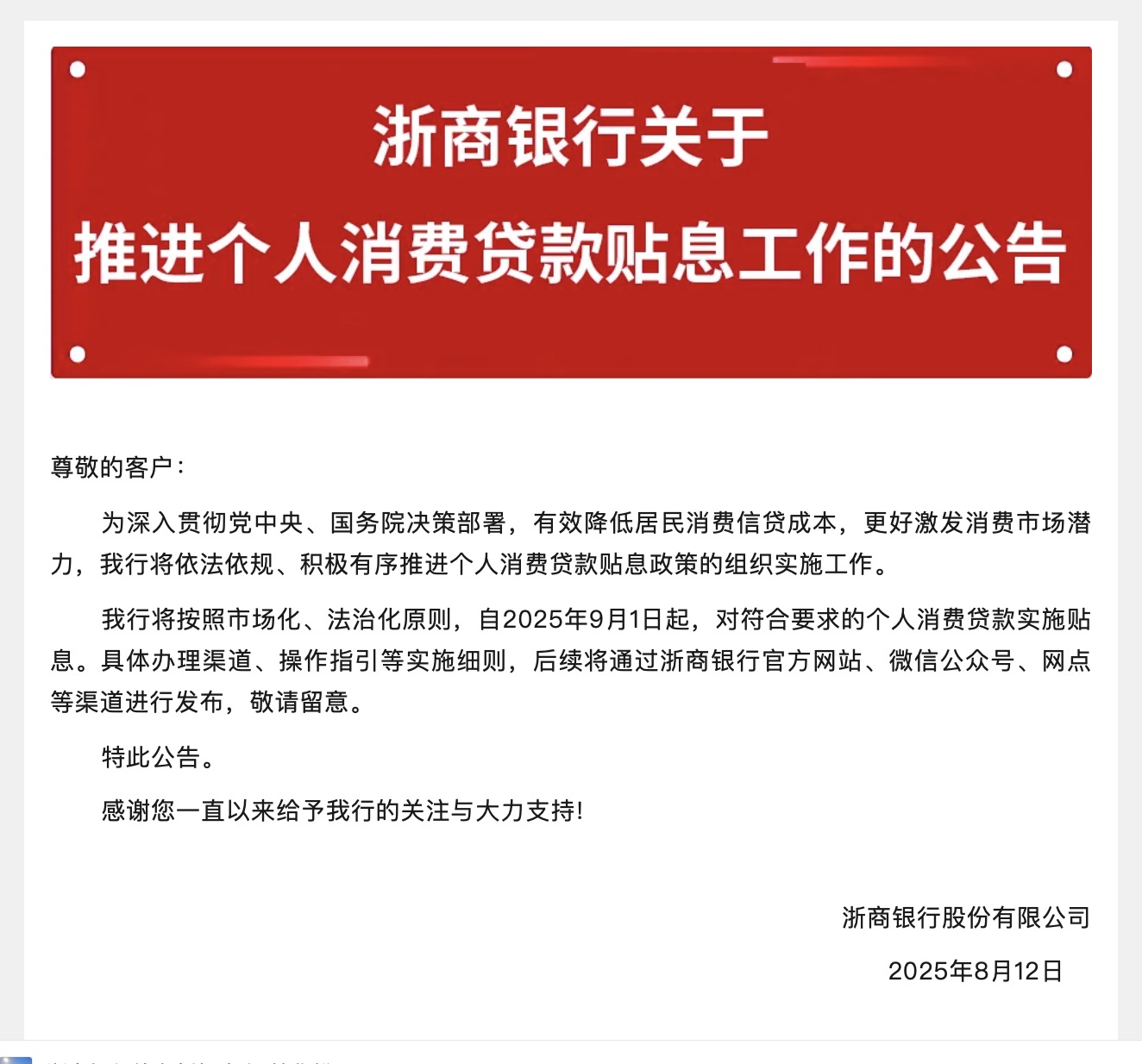 浙商銀行公告顯示,將依法依規(guī)、積極有序推進(jìn)個(gè)人消費(fèi)貸款貼息政策的組織實(shí)施工作。該行將按照市場化、法治化原則,自2025年9月1日起,對符合要求的個(gè)人消費(fèi)貸款實(shí)施貼息。