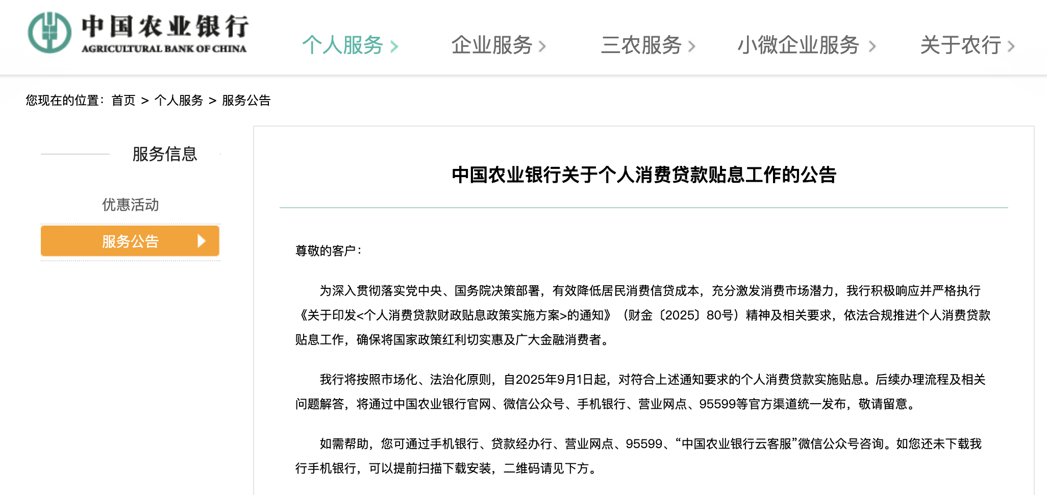 具體來看,農(nóng)業(yè)銀行公告提到,將按照市場化、法治化原則,自2025年9月1日起,對符合上述通知要求的個(gè)人消費(fèi)貸款實(shí)施貼息。