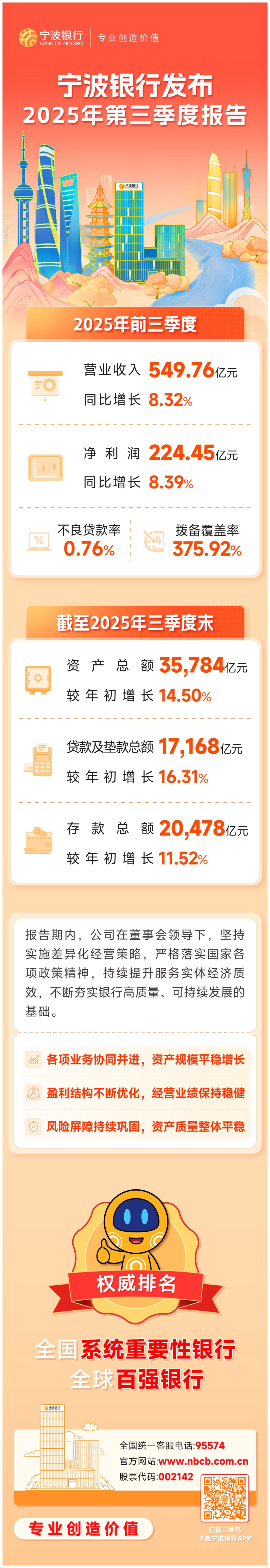2025年三季度,面對(duì)復(fù)雜嚴(yán)峻的內(nèi)外部經(jīng)營(yíng)環(huán)境,寧波銀行在董事會(huì)的領(lǐng)導(dǎo)下,堅(jiān)持實(shí)施差異化經(jīng)營(yíng)策略,嚴(yán)格落實(shí)國(guó)家各項(xiàng)政策精神,持續(xù)提升服務(wù)實(shí)體經(jīng)濟(jì)的質(zhì)效,不斷夯實(shí)銀行高質(zhì)量、可持續(xù)發(fā)展的基礎(chǔ)。