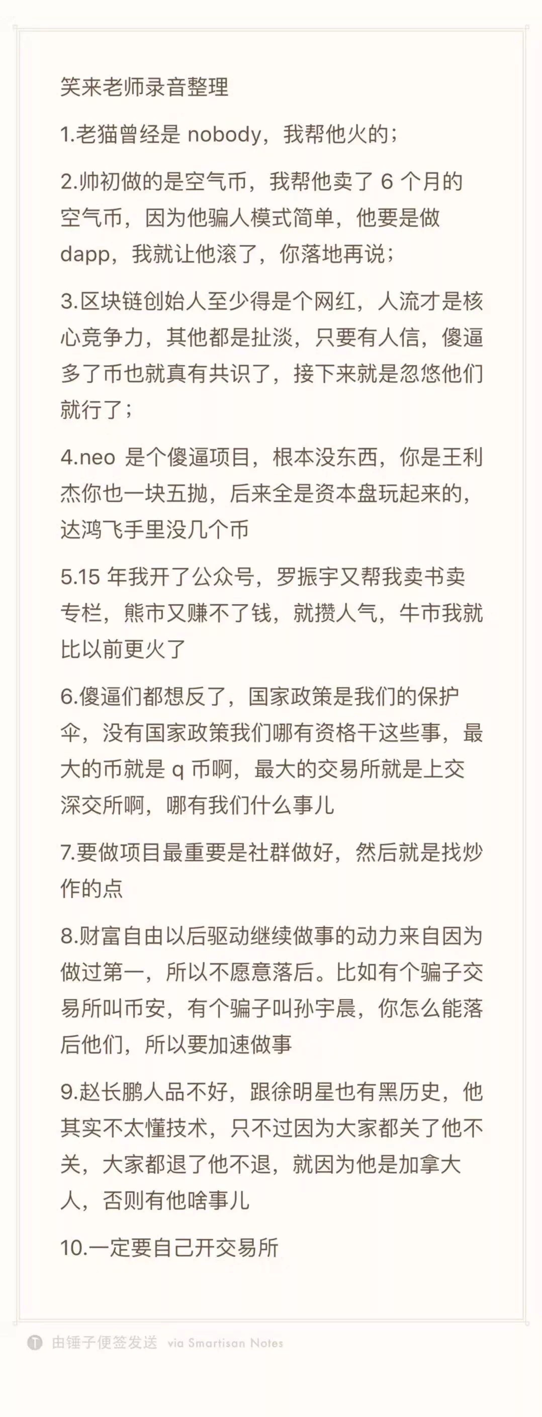 這段錄音中,李笑來(lái)談話涉及多位區(qū)塊鏈項(xiàng)目和幣圈人物,比如老貓、neo、以太坊、Ripple、易理華、羅振宇等人。