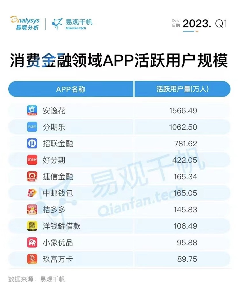 榜單顯示,APP作為消費金融機構促消費的重要觸點,2023年第一季度,消費金融行業(yè)APP活躍用戶規(guī)模為3944.72萬人。從具體APP活躍用戶規(guī)模來看,馬上消費旗下APP安逸花活躍用戶規(guī)模為1566.49萬人。從以往易觀分析公布的數(shù)據(jù)來看,安逸花APP在多個季度、半年度的榜單中活躍用戶規(guī)模都位列第一。