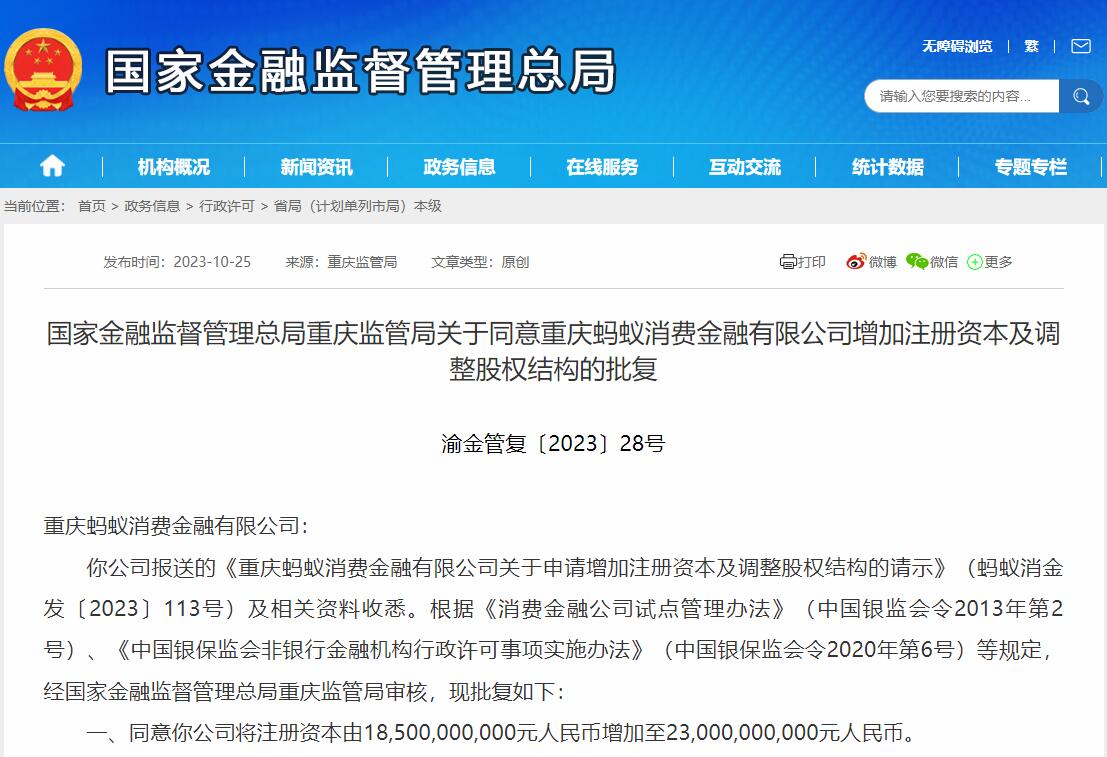 10月25日,根據(jù)國(guó)家金融監(jiān)督管理總局官網(wǎng),經(jīng)國(guó)家金融監(jiān)督管理總局重慶監(jiān)管局審核批復(fù),同意重慶螞蟻消費(fèi)金融有限公司(下稱:螞蟻消金)將注冊(cè)資本由185億元人民幣增加至230億元人民幣。此次增加注冊(cè)資本并調(diào)整股權(quán)結(jié)構(gòu)后,螞蟻消金股東達(dá)13家。