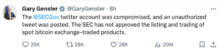 此次重大消息一出,幣圈市場立馬沉浸在一片快樂喜悅的氛圍之中。但很快,SEC主席GaryGensler在其個人的X賬號上發(fā)帖稱,SEC的官方賬號遭受到黑客攻擊,發(fā)布了未經授權的帖子,SEC并沒有批準比特幣現(xiàn)貨ETF上市和交易。隨后,SEC的官方賬號也發(fā)布了同樣的聲明,并刪除了此前的帖子。這段時間內,比特幣大幅波動逾3000美元,全網加密貨幣在一小時內超4000萬美元資金爆倉。