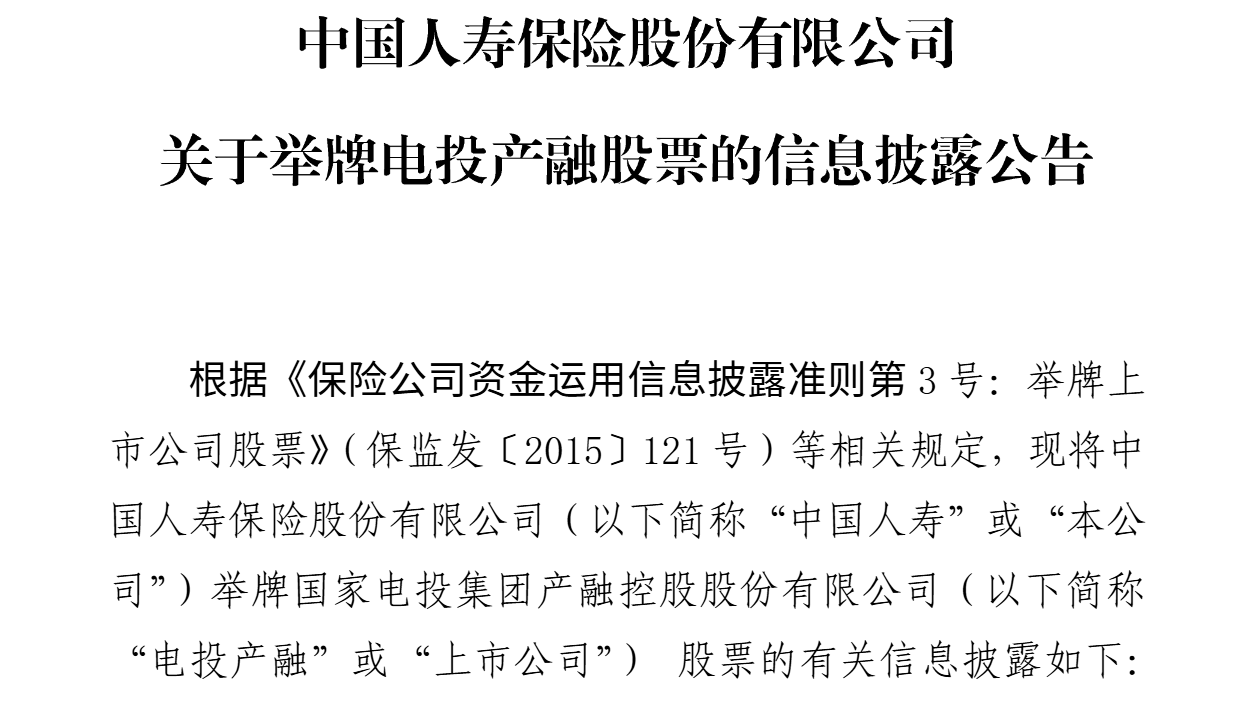 具體來看,本次權(quán)益變動前,中國人壽持有電投產(chǎn)融股份321,500股,中國人壽一致行動人中國人壽資產(chǎn)管理有限公司通過其管理的中證A500指數(shù)及多資產(chǎn)量化對沖1號產(chǎn)品持有電投產(chǎn)融股份134,200股,中國人壽及其一致行動人合計持有電投產(chǎn)融股份455,700股,占本次交易前電投產(chǎn)融總股本的0.00814%,按照本次交易方案,中國人壽擬以持有的國電投核能有限公司26.76%股權(quán)認購電投產(chǎn)融新發(fā)行股份4,330,242,827股(獲得增發(fā)的股份數(shù)量最終以經(jīng)深圳證券交易所審核通過并獲得中國證監(jiān)會同意注冊后的數(shù)量為準)。