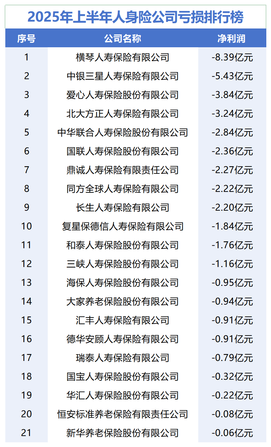 虧損險(xiǎn)企中,橫琴人壽保險(xiǎn)有限公司虧損額最高,虧損8.39億元。中銀三星人壽保險(xiǎn)有限公司、愛心人壽保險(xiǎn)股份有限公司分別虧損5.43億元、3.84億元,位列第二名、第三名。