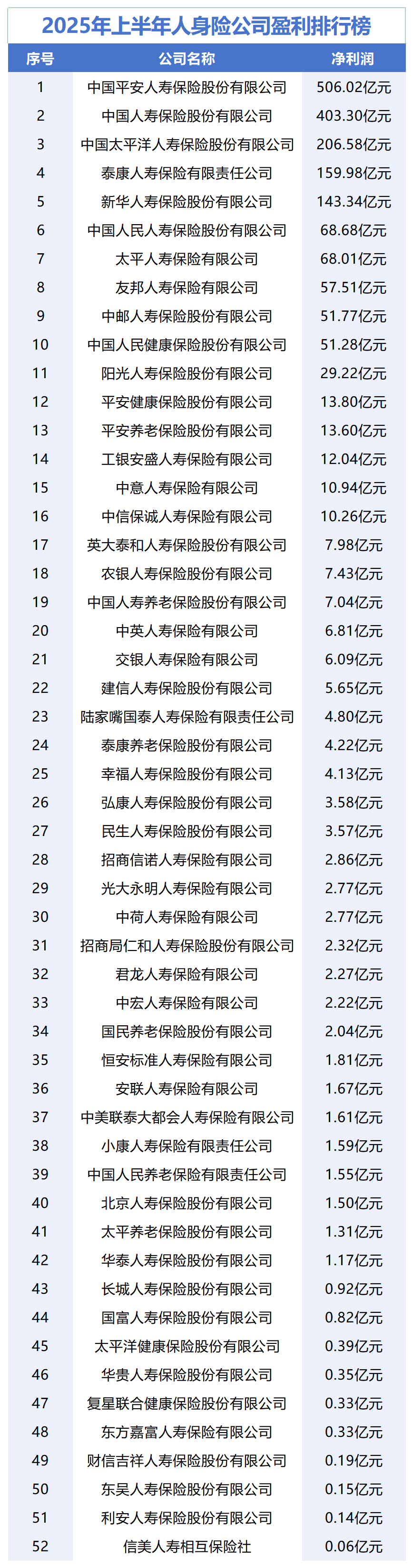 盈利險(xiǎn)企中,中國平安人壽保險(xiǎn)股份有限公司(以下簡(jiǎn)稱“平安人壽”)、中國人壽保險(xiǎn)股份有限公司(以下簡(jiǎn)稱“中國人壽”)、中國太平洋人壽保險(xiǎn)股份有限公司(以下簡(jiǎn)稱“太保壽險(xiǎn)”)、泰康人壽保險(xiǎn)有限責(zé)任公司(以下簡(jiǎn)稱“泰康人壽”)和新華人壽保險(xiǎn)股份有限公司(以下簡(jiǎn)稱“新華保險(xiǎn)”)的凈利潤均超過100億元,分別以506.02億元、403.30億元、206.58億元、159.98億元和143.34億元凈利潤居前五名。