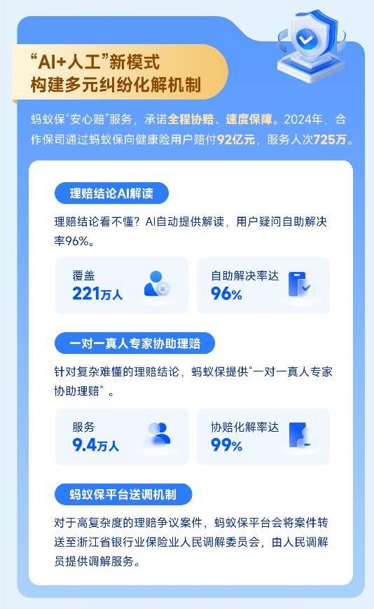據(jù)介紹,2024年螞蟻保的“AI自助解讀”共為221萬用戶提供了理賠結(jié)論解讀,用戶疑問自助解決率96%;“真人協(xié)賠專家”則為理賠糾紛用戶提供理賠協(xié)助服務(wù),2024年服務(wù)9.4萬名用戶,協(xié)賠化解率達(dá)99%。