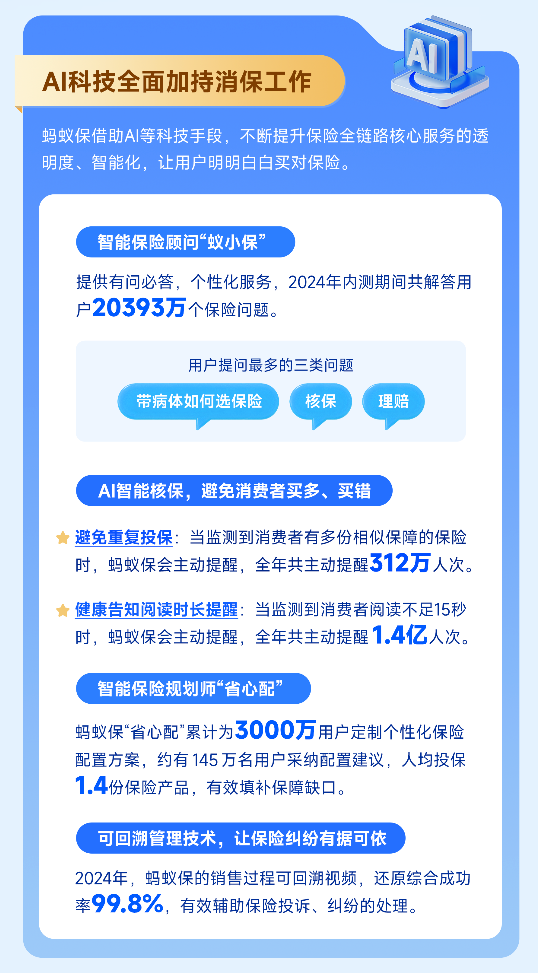 AI方面,螞蟻保上線了智能保險(xiǎn)顧問“蟻小保”、AI智能核保、AI自助解讀等AI應(yīng)用,僅蟻小保在內(nèi)測期間就解答了用戶2萬多個(gè)保險(xiǎn)疑問;人工方面,螞蟻保建立了包含協(xié)賠專家的多元糾紛化解機(jī)制,在2024年協(xié)賠專家累計(jì)為7萬人次提供一對一協(xié)助理賠服務(wù)。