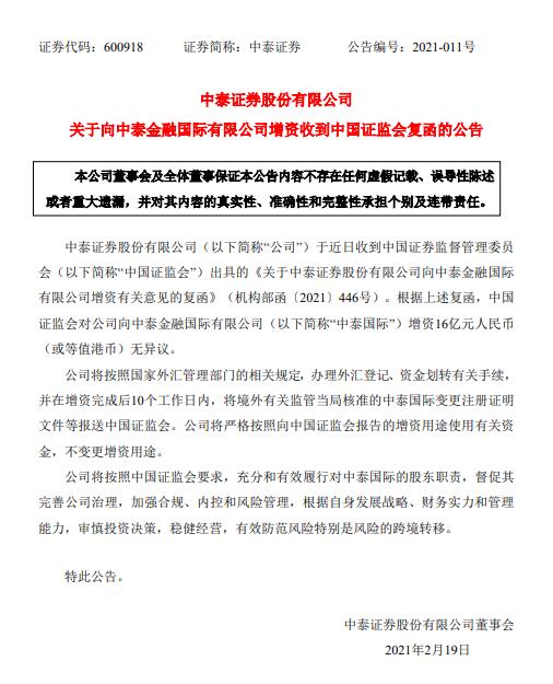 2月19日晚間,中泰證券發(fā)布公告稱,于近日收到中國(guó)證監(jiān)會(huì)出具的《關(guān)于中泰證券股份有限公司向中泰金融國(guó)際有限公司增資有關(guān)意見的復(fù)函》(機(jī)構(gòu)部函〔2021〕446號(hào))。根據(jù)上述復(fù)函,中國(guó)證監(jiān)會(huì)對(duì)公司向中泰金融國(guó)際有限公司(以下簡(jiǎn)稱“中泰國(guó)際”)增資16億元人民幣(或等值港幣)無異議。