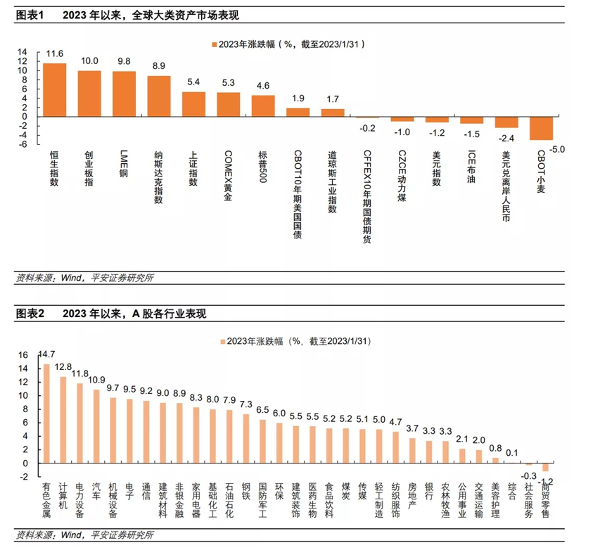 市場(chǎng)的短期邏輯得到了較好的印證和兌現(xiàn)。具體分析來(lái)看,第一,長(zhǎng)期以來(lái)制約市場(chǎng)和經(jīng)濟(jì)的疫情因素大幅緩解。2023年疫情將不再成為市場(chǎng)的核心要素,相反疫情之后經(jīng)濟(jì)發(fā)展的動(dòng)能何在,政府、企業(yè)、個(gè)人對(duì)于經(jīng)濟(jì)發(fā)展的訴求將逐漸成為市場(chǎng)的主要關(guān)注點(diǎn);第二,經(jīng)濟(jì)在復(fù)蘇期有利于權(quán)益資產(chǎn)的格局不變。在確認(rèn)了2022年四季度(受疫情影響)較低的增速之后(投資、消費(fèi)、進(jìn)出口全方位的滑落),2023年一季度中國(guó)經(jīng)濟(jì)正式進(jìn)入修復(fù)及復(fù)蘇階段,這不僅僅是預(yù)期先行,也是海內(nèi)外的共識(shí)(關(guān)系到海外資金的持續(xù)流入);第三,結(jié)構(gòu)上出行消費(fèi)、服務(wù)消費(fèi)先行,投資、制造等領(lǐng)域也將加快投入力度。1月份及春節(jié)期間市場(chǎng)關(guān)注的高頻數(shù)據(jù),包括旅游、影視、出行等方面數(shù)據(jù)給予了市場(chǎng)一定的信心,平安證券判斷后續(xù)在制造業(yè)、投資等數(shù)據(jù)上也會(huì)出現(xiàn)好的變化。