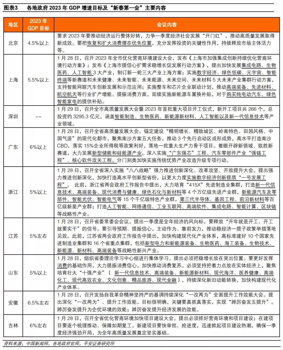 此外,平安證券關(guān)注到春節(jié)之后各地政府發(fā)展經(jīng)濟(jì)搶跑的跡象,廣東、浙江、安徽、吉林、上海等地都召開(kāi)了省級(jí)層面的“新春第一會(huì)”及新一輪優(yōu)化營(yíng)商環(huán)境行動(dòng)方案,從部署內(nèi)容來(lái)看,高質(zhì)量發(fā)展、優(yōu)化營(yíng)商環(huán)境、重點(diǎn)項(xiàng)目建設(shè)等主題是關(guān)注的重點(diǎn)。當(dāng)結(jié)合推動(dòng)高質(zhì)量發(fā)展、發(fā)展現(xiàn)代產(chǎn)業(yè)體系、統(tǒng)籌發(fā)展和安全、全面深化改革開(kāi)放、大力提振市場(chǎng)信心、把實(shí)施擴(kuò)大內(nèi)需戰(zhàn)略同深化供給側(cè)結(jié)構(gòu)性改革有機(jī)結(jié)合起來(lái)等關(guān)鍵詞看,新一輪政府發(fā)力經(jīng)濟(jì)建設(shè),不僅符合中國(guó)中長(zhǎng)期的發(fā)展規(guī)劃,也符合疫情之后企業(yè)和個(gè)人對(duì)于美好生活的向往。而行業(yè)層面則看到了諸多政策的優(yōu)化和調(diào)整,比如房地產(chǎn)、互聯(lián)網(wǎng)、教育、醫(yī)療、游戲等。中國(guó)資本市場(chǎng)在此過(guò)程中將推動(dòng)凝聚中長(zhǎng)期預(yù)期,2022年提風(fēng)物長(zhǎng)宜放眼量,2023年則是長(zhǎng)風(fēng)破浪會(huì)有時(shí),中國(guó)經(jīng)濟(jì)的韌性、中國(guó)企業(yè)的調(diào)整能力都會(huì)逐步地體現(xiàn)出來(lái)。