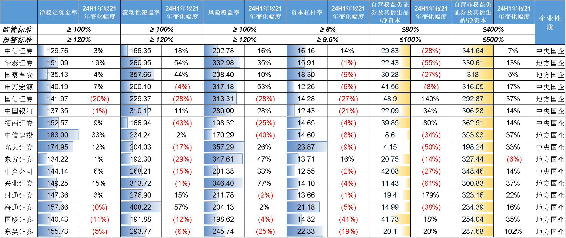 表1:2024上半年部分券商風(fēng)控指標(biāo)情況及較2021年變化