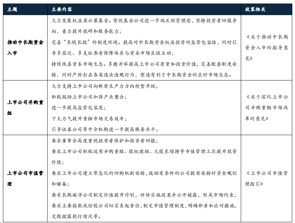 政策支持活躍并購(gòu)重組、一級(jí)市場(chǎng)重現(xiàn)生機(jī)。(1)證監(jiān)會(huì)將用好股票、債券、期貨等多種資本市場(chǎng)工具,活躍并購(gòu)重組市場(chǎng),將發(fā)布關(guān)于促進(jìn)并購(gòu)重組的六條措施。積極鼓勵(lì)上市公司加強(qiáng)產(chǎn)業(yè)整合,支持上市公司分期發(fā)行股份,提升重組市場(chǎng)交易效率。(2)金融監(jiān)管總局?jǐn)M擴(kuò)大銀行系金融資產(chǎn)投資公司股權(quán)投資試點(diǎn)范圍至18個(gè)城市,適當(dāng)放寬股權(quán)投資金額和限制。