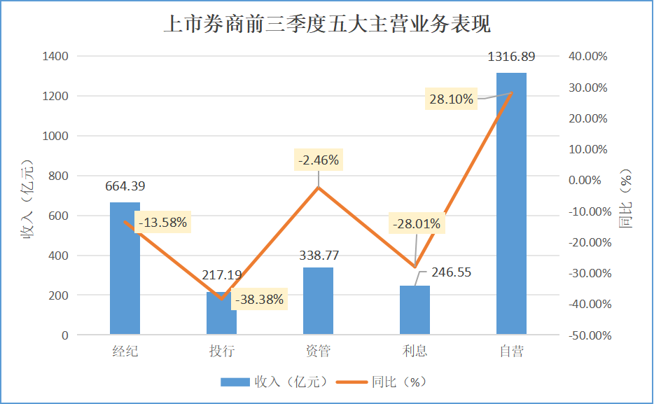 從券商五大主營(yíng)業(yè)務(wù)來(lái)看,前三季度,自營(yíng)業(yè)務(wù)無(wú)疑是上市券商業(yè)績(jī)的重要支撐,也是唯一實(shí)現(xiàn)收入同比增長(zhǎng)的業(yè)務(wù)。同時(shí),資管業(yè)務(wù)的加速轉(zhuǎn)型也展現(xiàn)出了初步的成效,其收入同比降幅在各大業(yè)務(wù)中相對(duì)較小,并且有多家券商實(shí)現(xiàn)了該項(xiàng)收入的同比顯著增長(zhǎng)。相比之下,經(jīng)紀(jì)業(yè)務(wù)、投行業(yè)務(wù)以及資本中介業(yè)務(wù)則受到市場(chǎng)波動(dòng)等多重因素的制約,整體業(yè)績(jī)表現(xiàn)不佳。
