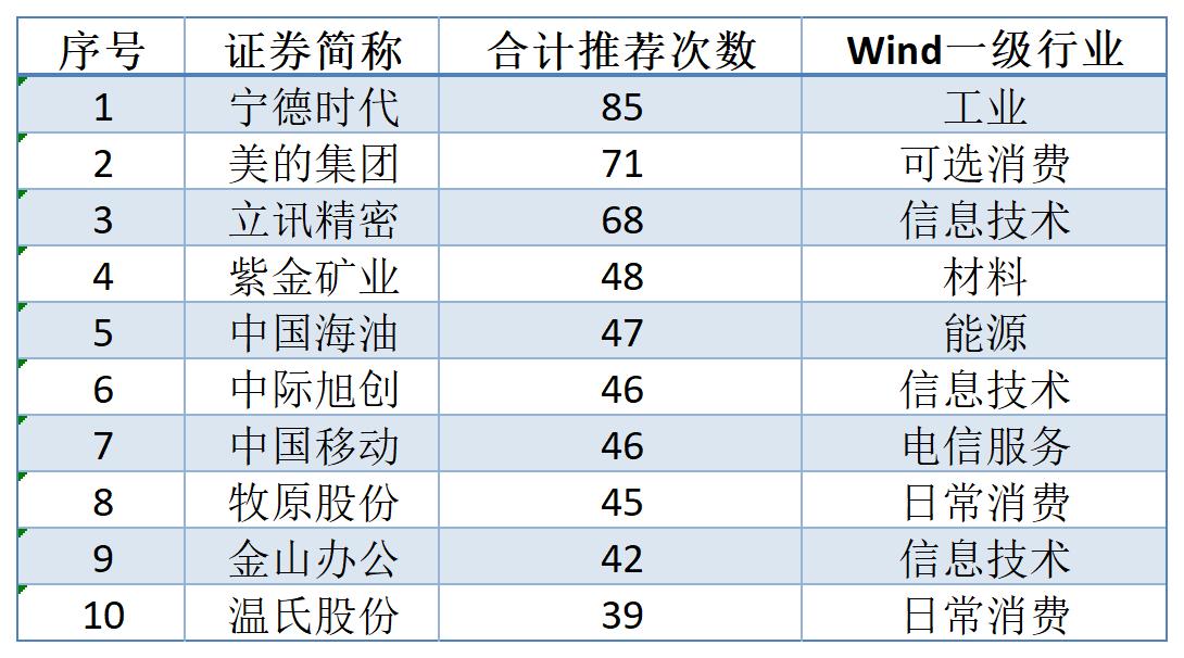 2024年合計(jì)被推薦次數(shù)前十金股 制圖/周尚伃于宏