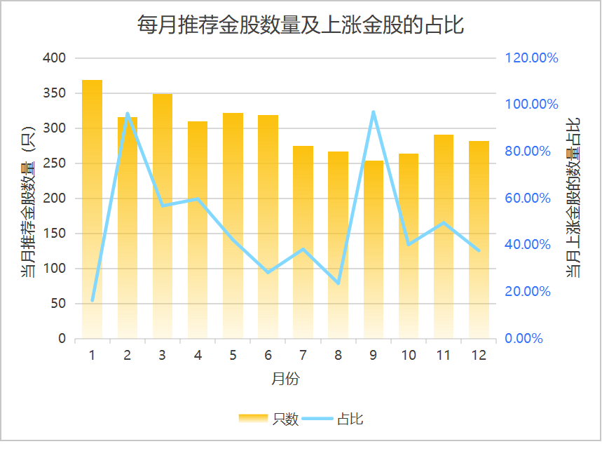 2024年每月券商推薦金股數(shù)量及當(dāng)月上漲金股占比 制圖/周尚伃于宏