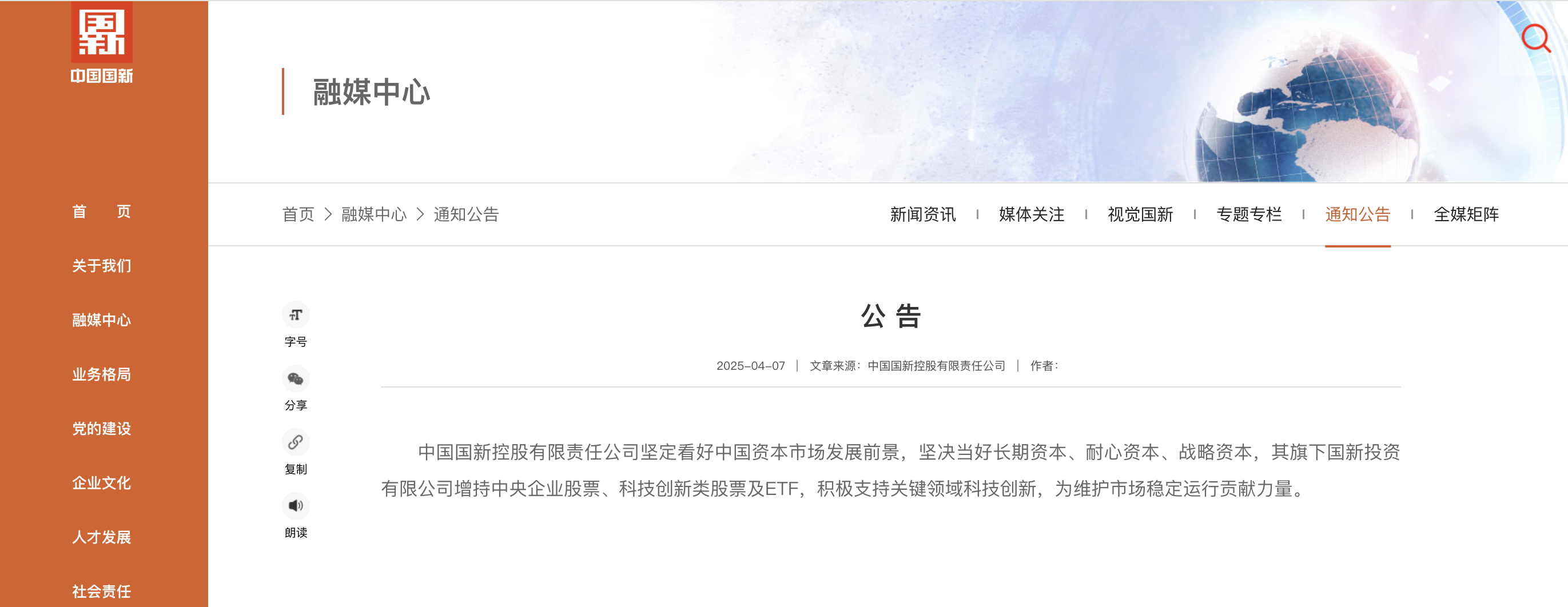 中國國新控股有限責任公司表示,堅定看好中國資本市場發(fā)展前景,堅決當好長期資本、耐心資本、戰(zhàn)略資本,其旗下國新投資有限公司增持中央企業(yè)股票、科技創(chuàng)新類股票及ETF,積極支持關鍵領域科技創(chuàng)新,為維護市場穩(wěn)定運行貢獻力量。