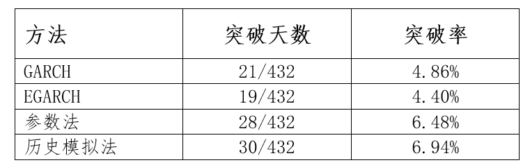 表2:模型VaR突破天數(shù)統(tǒng)計(jì)(預(yù)期突破率=5%)