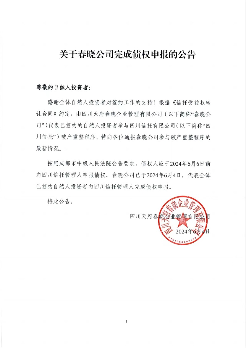 按照成都市中級人民法院公告要求,債權(quán)人應(yīng)于2024年6月6日前向四川信托管理人申報債權(quán)。春曉公司已于2024年6月4日,代表全體已簽約自然人投資者向四川信托管理人完成債權(quán)申報。